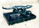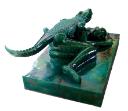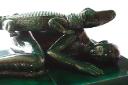 Dit jadegroene beeld van keramiek, een liggend mens met een krokodil op zijn lichaam, maakte Mimmo Paladino een jaar voor Beelden aan Zee het kocht. De mens, groot en rustig liggend op zijn bed-achtige lage sokkel lijkt de veel kleinere, kalme krokodil met gesloten bek toe te staan boven op hem te rusten. De krokodil was in het oude Egypte heilig en een symbool van kracht, macht en vruchtbaarheid. Maar in dit beeld is mens noch krokodil de machtigste, de mens lijkt eerder beschermd te worden door het zoveel sterkere beest. Paladino maakte veel tekeningen, beelden en schilderijen waarin dieren verbonden zijn aan mensen. Op verschillende wijze, uit de mythologie van diverse culturen - het christendom, het oude Egypte, de klassieke tijd, de moderne en tribale kunst... De expressie van de dieren is altijd stil en ingehouden, net zoals van de krokodil op de mens in dit beeld. Uomo e croccodillo hebben dezelfde fijn getekende huid en de voeten van de krokodil, geen klauwen, zijn een kleinere versie van de handen van de mens. Samen rusten zij.