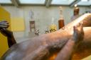 Vijf kleine aapjes wandelen over de buik van deze poetische, zwevende mensfiguur. Zou dit een illustratie kunnen zijn uit overgeleverde sprookjes en volksverhalen uit het Afrikaanse continent.